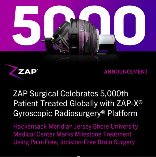 ZAP Surgical is proud to announce the 5,000th patient treated globally with the ZAP-X® Gyroscopic Radiosurgery® platform – a major milestone reflecting the platform’s rapid worldwide adoption.